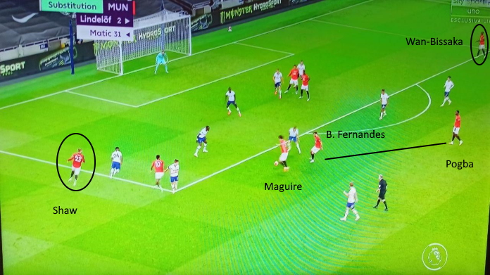 Il baricentro altissimo del Manchester United. I mediani, Pogba e Bruno Fernandes, praticamente al limite dell’area, con i terzini sulla stessa linea delle punte. Maguire, il terzo difensore di sinistra, è quasi dentro l’area del Tottenham. Gli Spurs sono barricati dietro.