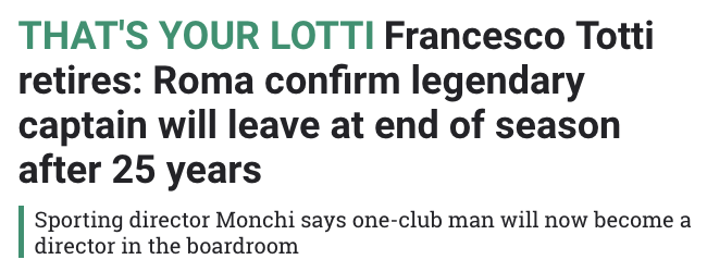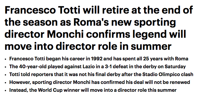 «Su Francesco dico solo che sono arrivato qui da una settimana e quello che so che già cera accordo tra lui e la Società su un ultimo anno da calciatore e a partire dal prossimo come dirigente della Roma», con queste parole il nuovo ds della Roma Monchi ha ufficializzato quello che da tempo ormai era chiaro a tutti: al termine di questa stagione Francesco Totti appenderà le scarpe al chiodo. L’annuncio ha fatto il giro del mondo e decine di giornali on line hanno rilanciato la notizia del ritiro. I britannici Sun e Daily Mail hanno omaggiato il capitano della Roma con foto e con titoli come “End of an Era”(Fine di un’era). Anche se di fatto il diretto interessato non si è espresso, tutti nel mondo del calcio hanno letto nelle parole del nuovo ds della Roma l’inevitabile addio della leggenda. Con l’addio di Totti viene ammainata l’ultima bandiera del calcio italiano e forse europeo. Il segno tangibile di quanto può aver inciso nell’immaginario degli amanti del calcio è dato anche dal fatto che molti club, attraverso i propri profili social, hanno voluto lanciare messaggi di ringraziamento per la sua splendida carriera.