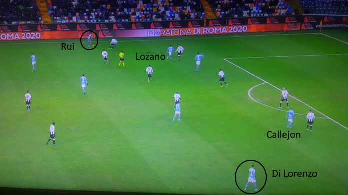 Di Lorenzo, che nel primo tempo giocava bloccato dietro, si è alzato, col passaggio quindi dalla difesa a 3 alla difesa a 4. Entrambi i terzini si sovrapponevano, quindi, con le ali che si stringevano molto. Si vede nella slide sopra. Di Lorenzo e Rui danno ampiezza al Napoli, con Lozano e Callejon che giocano dentro al campo. I cambi campo verso l’ex Empoli hanno spesso messo in crisi l’Udinese, con i partenopei che hanno acquisito pericolosità.