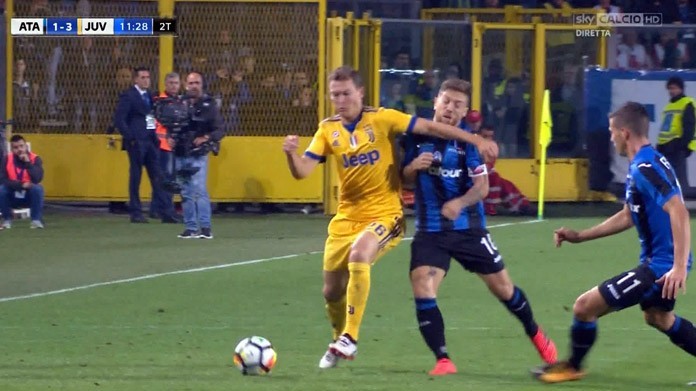 - Atalanta-Juventus. Siamo alla 7° giornata del girone d’andata di Serie A 2017/2018. Il match si concluderà 2-2: dopo il doppio vantaggio bianconero con Bernardeschi e Higuain, l’Atalanta accorcia le distanze con Caldara. Al minuto 58′, però, accade un episodio che avrebbe potuto indirizzare la partita in una direzione diversa da quella poi intrapresa. In prossimità della linea centrale del campo, sulla fascia destra, il terzino svizzero Lichtsteiner, nel tentativo di evitare il contrasto con Gomez, apre il braccio sinistro, rifilando una gomitata all’argentino. Damato non considera il fallo più che un semplice contrasto di gioco e fa proseguire l’azione, che si conclude con la rete del 1-3 di Mandzukic. Evidentemente richiamato dal VAR, Damato si convince a consultare il replay nella Referee Review Area. Dalla review, il direttore di gara ribalta la sua iniziale decisione: annulla il goal e ammonisce Lichtsteiner. La polemica è scattata nel momento in cui, dopo aver annullato la rete, Damato non ha estratto il cartellino rosso, poiché non ha evidentemente ricondotto il fallo a un’azione mossa da condotta violenta e antisportiva.