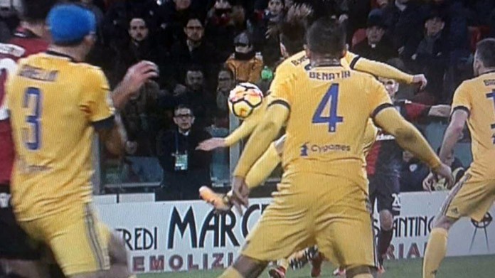 - Cagliari-Juventus. Siamo alla 20° giornata di Serie A 2017/2018 e si verifica un episodio analogo a quello precedentemente analizzato. Su un cross proveniente dalla fascia effettuato dall’ex Padoin, Bernardeschi, posizionato sulla linea perimetrale dell’area di rigore, devia in maniera piuttosto goffa il pallone, colpendolo con il braccio sinistro, frutto di un mobimento non proprio naturale. Nonostante le accese e immediate proteste dei cagliaritani, il direttore di gara Calvarese decide di non assegnare il calcio di rigore, ritenendo il tocco involontario. Di per sé, il VAR non è necessitato a intervenire perché l’azione rientra nella sfera del “non intervento” e, ancora una volta, Silent Check, in quanto l’arbitro ha visto l’azione e ha espresso la sua decisione, essendo lui il “detentore” della decisione finale. Prima di far riprendere il gioco (con il pallone finito in calcio d’angolo), Calvarese sembra, però, tentennare, per via del probabile consulto con il VAR Banti, non tornando più indietro nella sua decisione, in quanto, probabilmente, supportato dal consiglio del VAR.