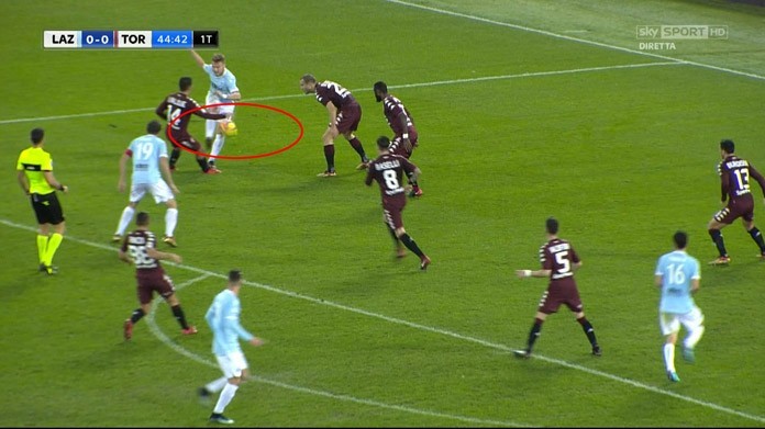 - Lazio-Torino. Siamo alla 16° giornata di Serie A 2017/2018. Ammesso che la Lazio sia stata, per sua sfortuna, una delle squadre che dal VAR ha ricevuto più “torti”, la sconfitta con il Torino è stata, effettivamente, segnata da più di un errore. L’ultimo minuto del primo tempo, quando la partita era ancora sullo 0-0, Giacomelli si rende protagonista di scelte assai discutibili. Su cross di Immobile in area di rigore granata, il pallone finisce sul braccio, molto distante dal corpo, di Iago Falque, modificando inevitabilmente la traiettoria dello stesso. Nonostante la distanza ravvicinata, il braccio è molto largo ma Giacomelli, con evidenti gesti, esprime la sua decisione, favorita anche dal Silent Check di Di Bello. Sul prosieguo dell’azione, la palla arriva nuovamente a Immobile che, su assist di Milinkovic-Savic, fa partire un potente tiro che si infrange sui cartelloni pubblicitari a fianco della porta difesa da Sirigu. L’attenzione si catalizza, però, sul diverbio nato immediatamente dopo l’azione tra lo stesso attaccante e Burdisso e finito con un abbozzo testata di Immobile sul difensore. Giacomelli non vede ma viene avvisato da Di Bello, invitando l’arbitro centrale ad andare a rivedere l’azione. Sul consulto del video, Giacomelli estrae immediatamente il cartellino rosso, nonostante avrebbe potuto tener conto anche della provocazione dell’argentino e procedere con la semplice ammonizione, dovuta a un comportamento antisportivo dell’attaccante, ma di certo non poi eccessivamente violento.
