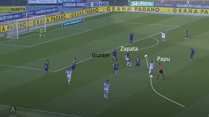 Si vede nella slide sopra, con l’intero Verona corto in pochissimi metri. L’Atalanta è troppo stretta, al Papu mancano soluzioni di passaggio.