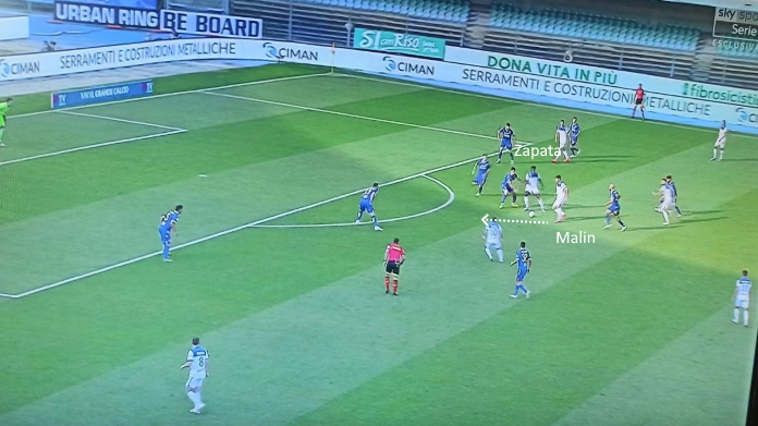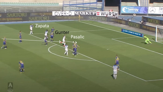 L’occasione di inizio match. Pasalic aggredisce gli spazi liberati da Zapata (che fa anche da parete), mentre Malinovsky resta bloccato.