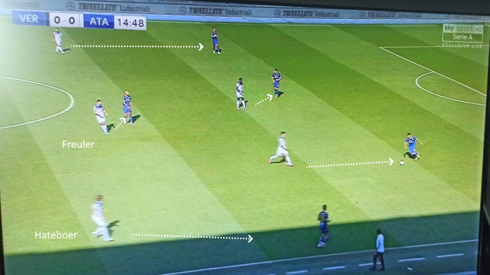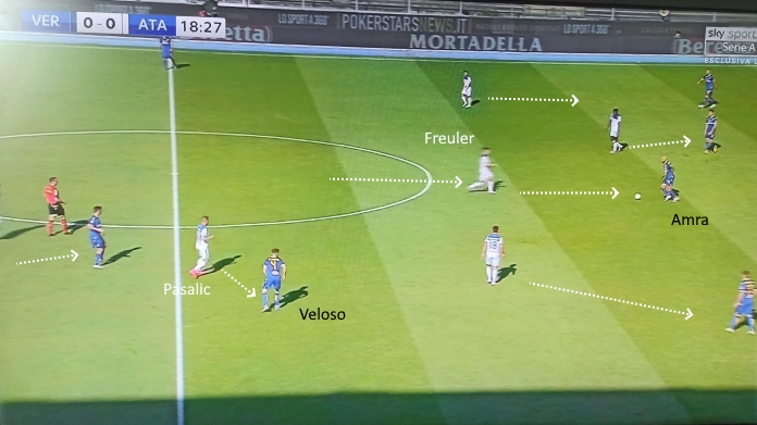 In particolar modo, è stato degno di nota il lavoro di Pasalic e Freuler, che si dovevano occupare di Miguel Veloso e Amrabat. I due mediani erano tempestivi e puntuali nel marcare i due centrocampisti scaligeri, con il Verona che raramente li ha trovati liberi poiché venivano seguiti dappertutto. L’Hellas ha quindi lanciato tante volte lungo per le punte, proprio perché non c’era modo di risalire palleggiando sul breve.
