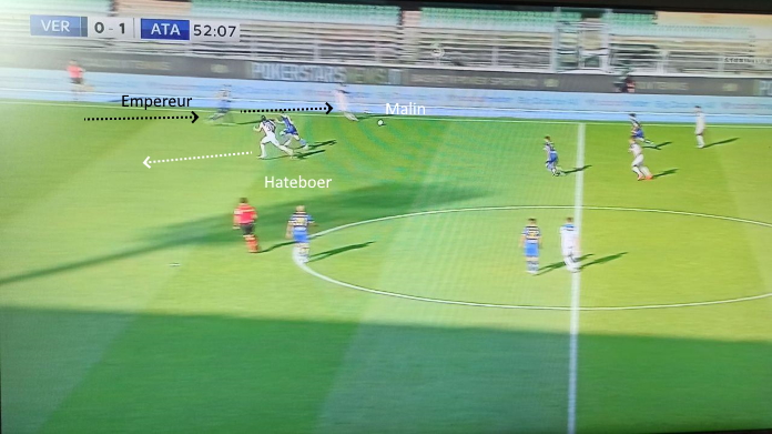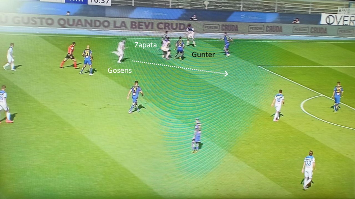 Si vede nella slide sopra. Nella prima, Malinovskyi si apre, con Empereur (il terzo centrale di sinistra) che esce sull’ucraino. Nella seconda, Zapata e Djimsiti portano fuori posizione Gunter e Rrahmani, con Gosens che si butta in mezzo.