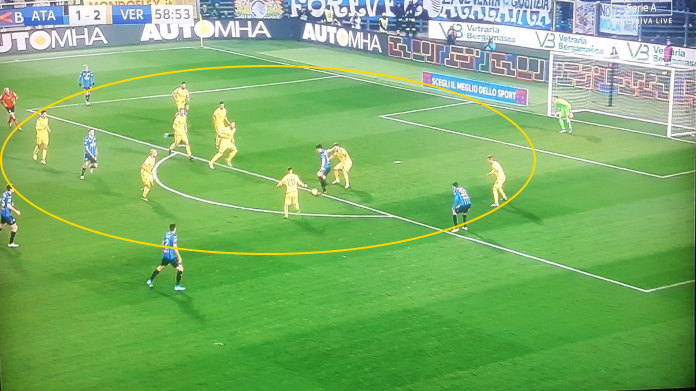 Tuttavia, l’Hellas non estremizza le marcature a uomo. Quando l’avversario consolida il possesso e schiaccia il Verona, c’è la capacità di coprire bene la propria trequarti, difendendosi bassi. Un esempio nella slide sopra, in cui il Verona è molto stretto. Insomma, c’è la capacità di interpretare più spartiti.