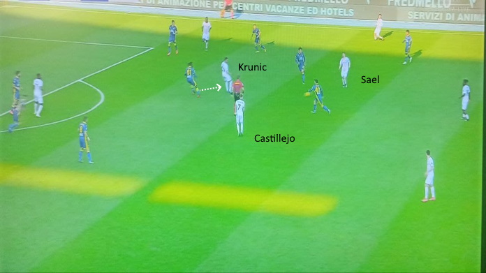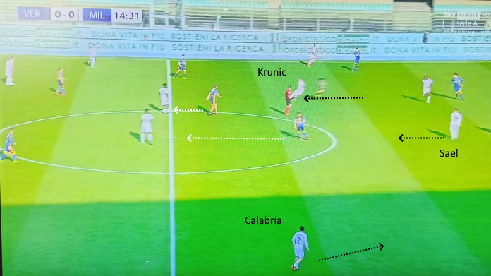 Il Verona ha faticato molto nel leggere i movimenti suoi e di Saelamaekers, come si è visto in occasione del gol di Dalot. L’ex Empoli è venuto molto incontro senza che nessuno seguisse il suo movimento, per ricevere palla dalla difesa. Krunic a quel punto ha ben servito il solissimo Saelemaekers tra le linee, che ha poi generato l’assist. Un’azione che dimostra bene come il Verona fosse più perforabile del solito.