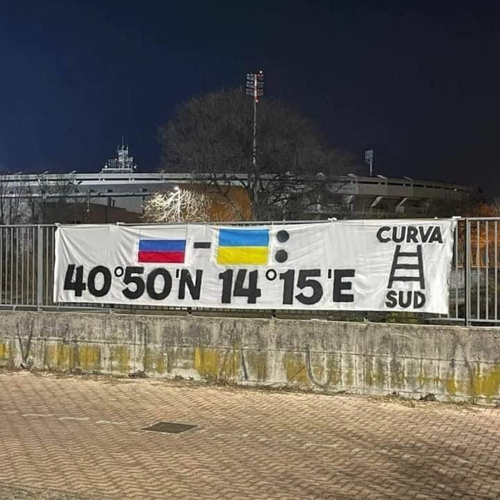 I tifosi scaligeri hanno esposto uno striscione choc, come riportato anche da Tuttonapoli.net, nel quale si vede la foto con la frase. Due bandiere quelle di Russia e Ucraina con le coordinate di Napoli, quasi a significare dove bombardare. Inaccettabile e vergognoso.