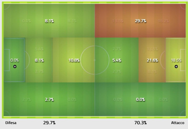 A eccezione della fascia di destra in zona avanzata e della propria area di rigore, dove non ha toccato neanche un pallone, Leao ha agito un po’ ovunque. I tocchi di palla dicono che Pioli lo ha sistemato ancora sulla corsia di sinistra, dove per l’appunto pensa che Rafa possa sprigionare il massimo del suo potenziale. Ma se quel 29,7% è dominante, sono molti anche i palloni toccati sulla trequarti al centro, molto vicino a Giroud (21,6%). Una condizione che gli permette anche di agire in area di rigore ed è estremamente significativo che abbia calciato verso la porta in due circostanze. Conclusioni che sono arrivate sul centro-destra, denotando movimenti da punta più centrale: evidentemente il suo desiderio espresso all’allenatore è reale e Leao è intenzionato a perseguirlo.